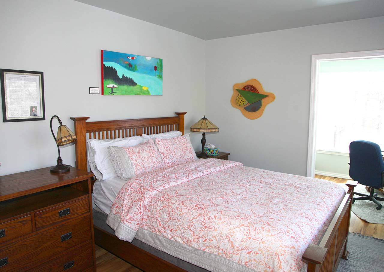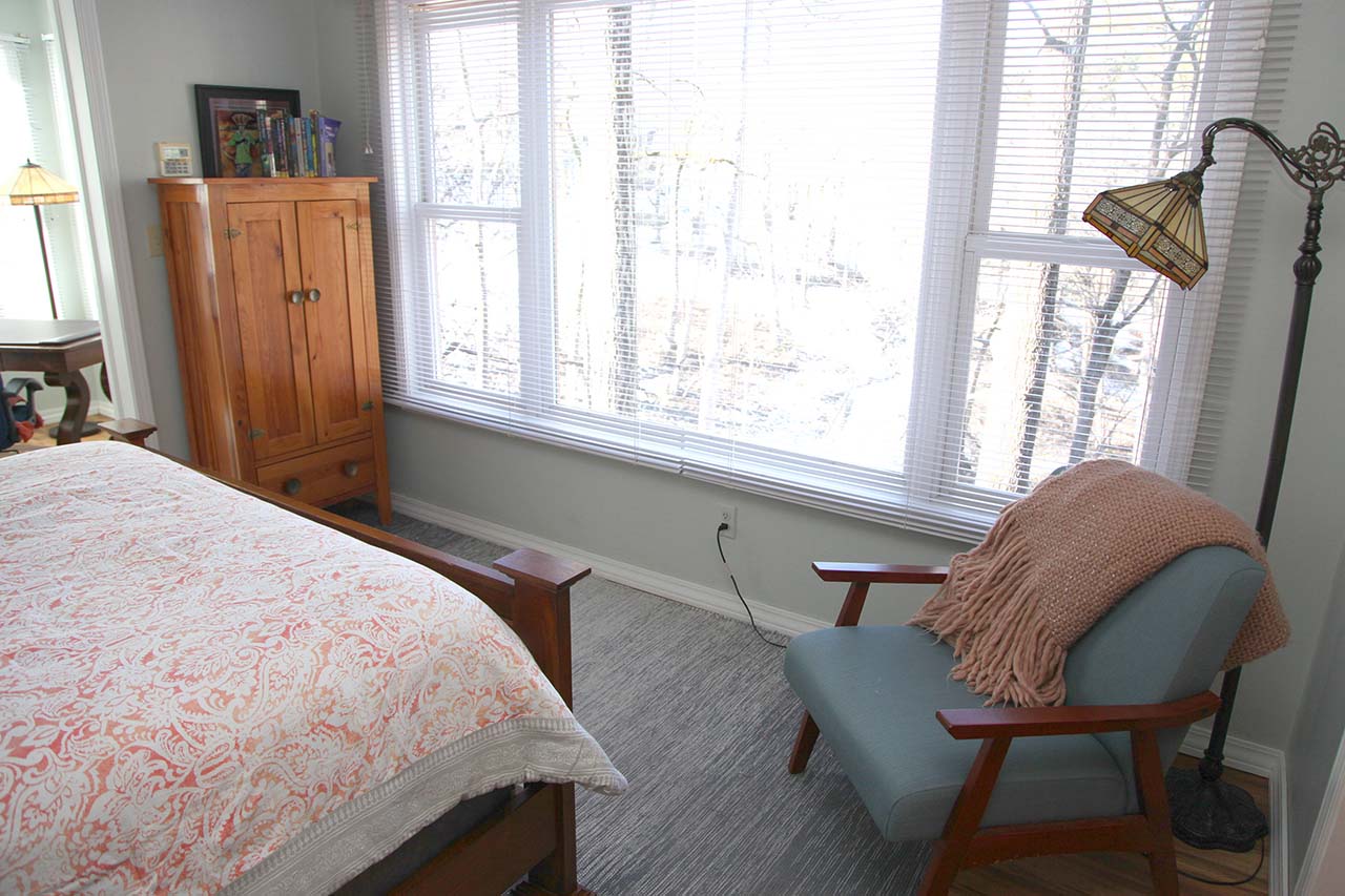 The suite opens to the bedroom with, Queen Bed, and a comfortable reading chair. The room is filled with natural light. The windows in the bedroom overlook a park and beautiful landscape. The windows have full length shades, so privacy or less light is always possible.