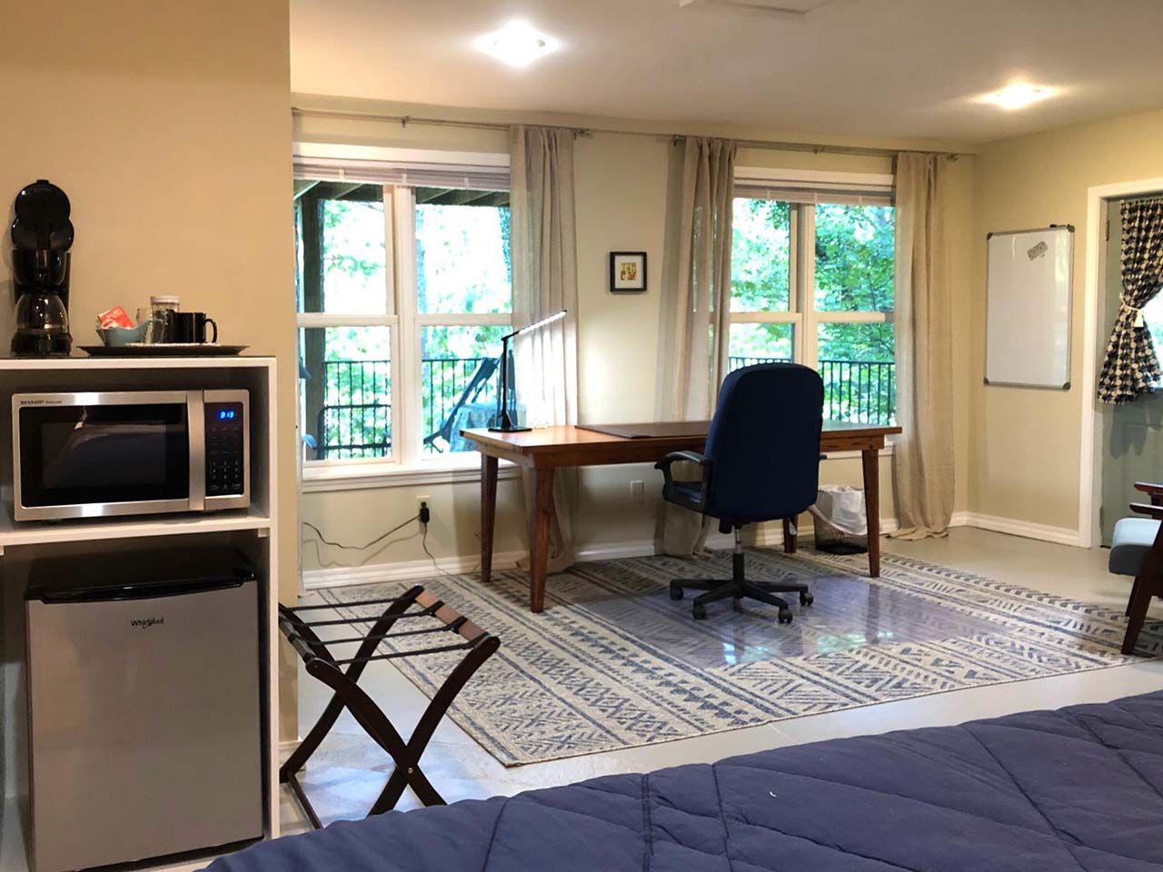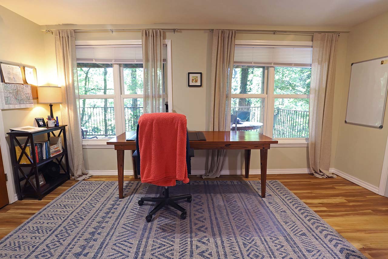 The writing area looks out over a lower deck with two large windows. The desk is large, great for spreading out and working on projects.