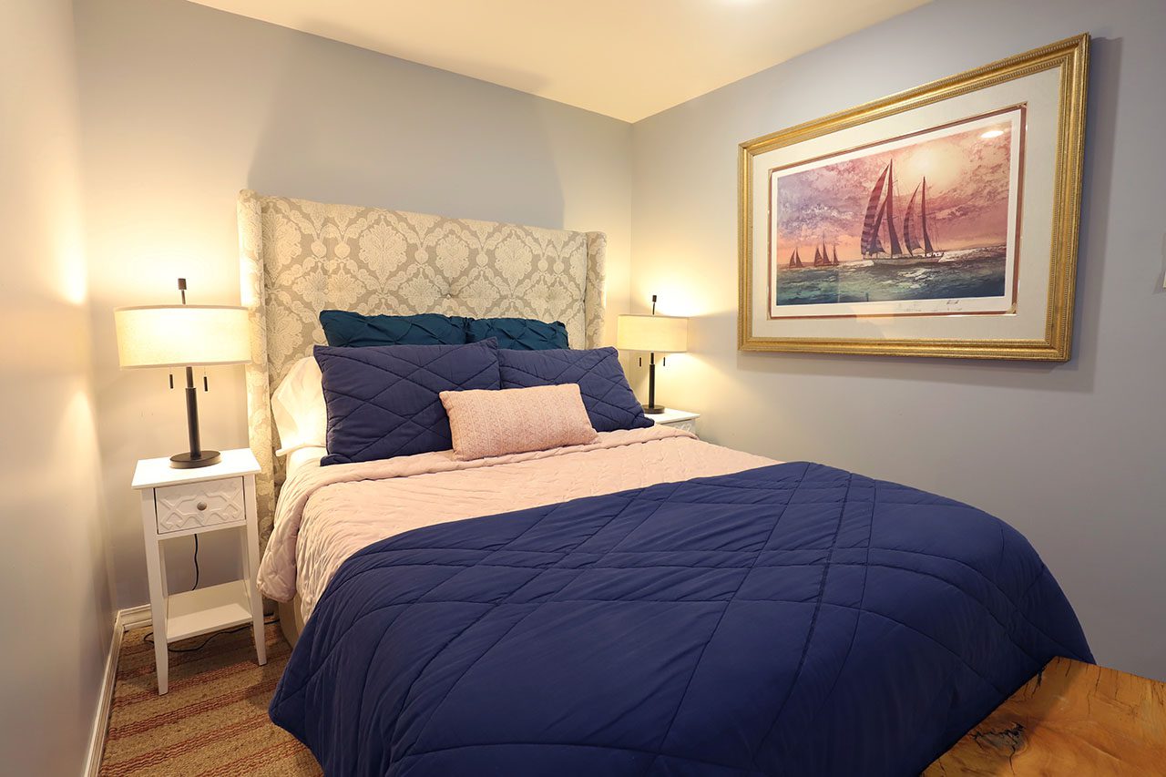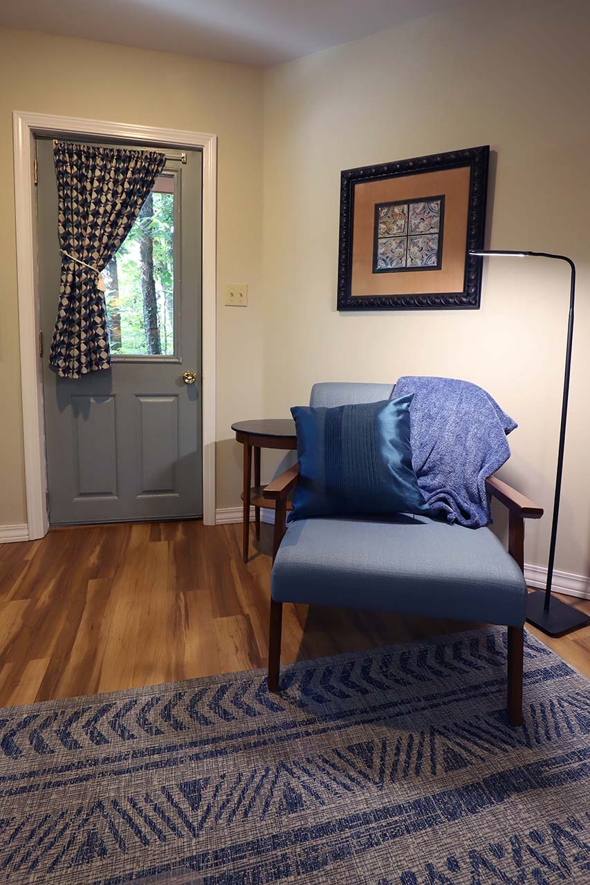 The suite opens to a spacious room with, Queen Bed, reading chair. The writing desk and bedroom are in the same room, but the layout of the space works very well. The suite offers a private side deck with bistro table and chairs. Perfect for coffee and a book. The suite includes a mini fridge, microwave and coffee maker.
