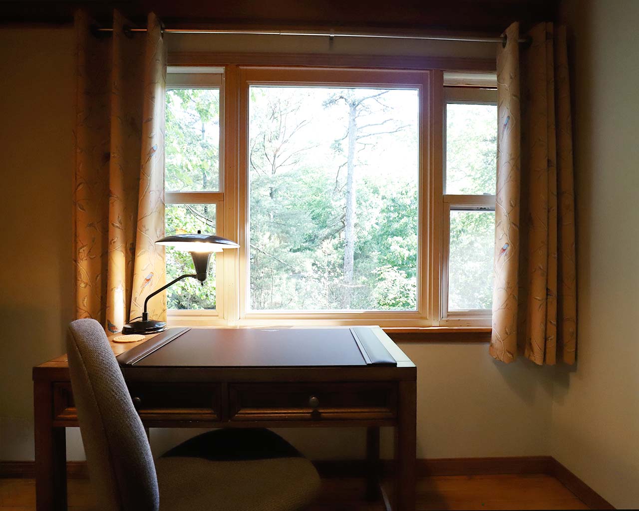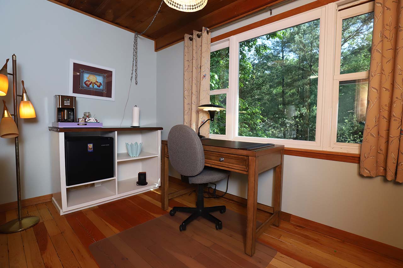 The writing room is straight through the bedroom area. It is a spacious room with a good size desk. The desk faces a large window overlooking the park across the street and the beautiful landscape of Eureka.