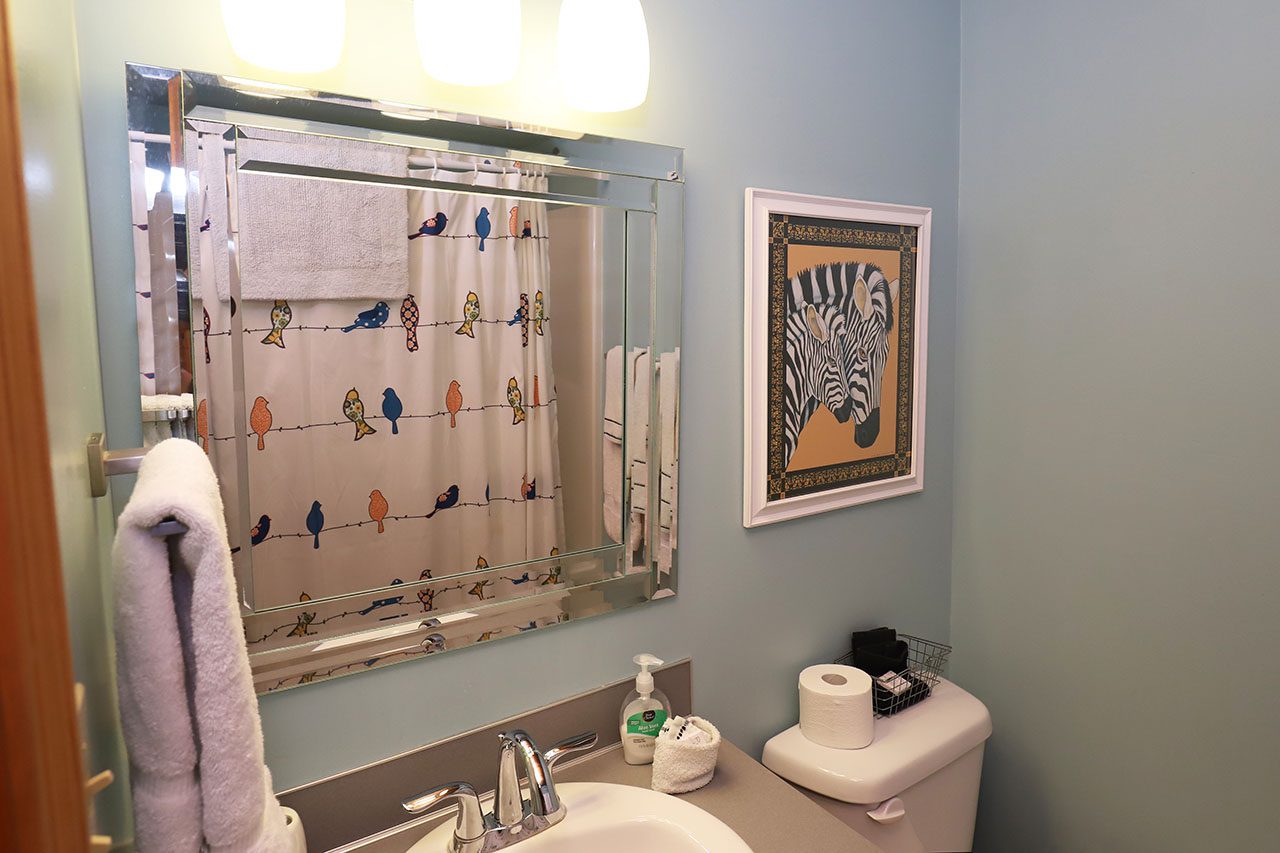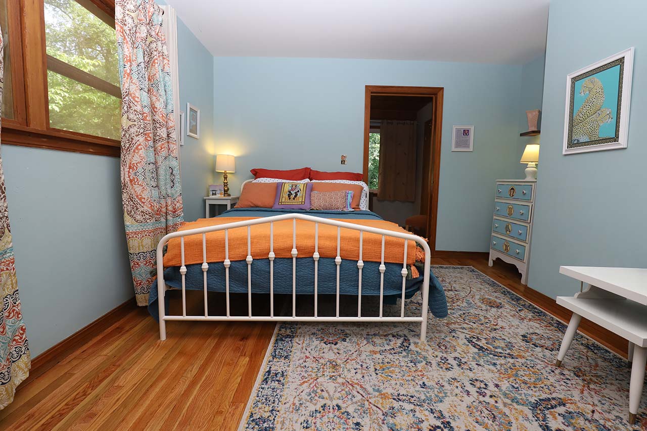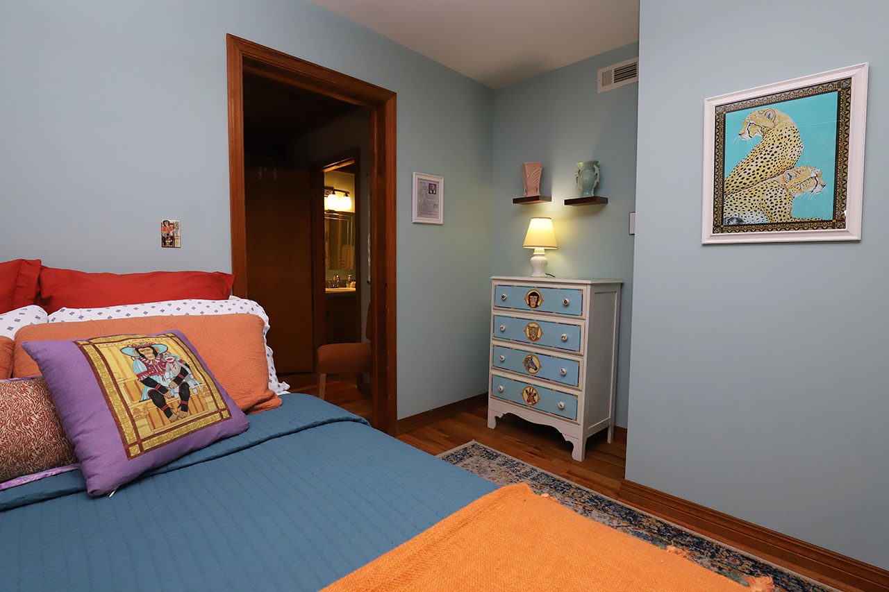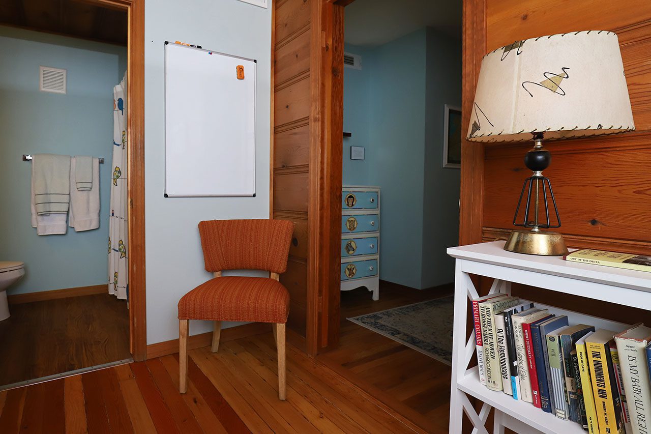 The suite opens to a colorful room with, Queen Bed, and reading chair. The walls are adorned with Zeek Taylors art as well you will find a few of his books in the suite.